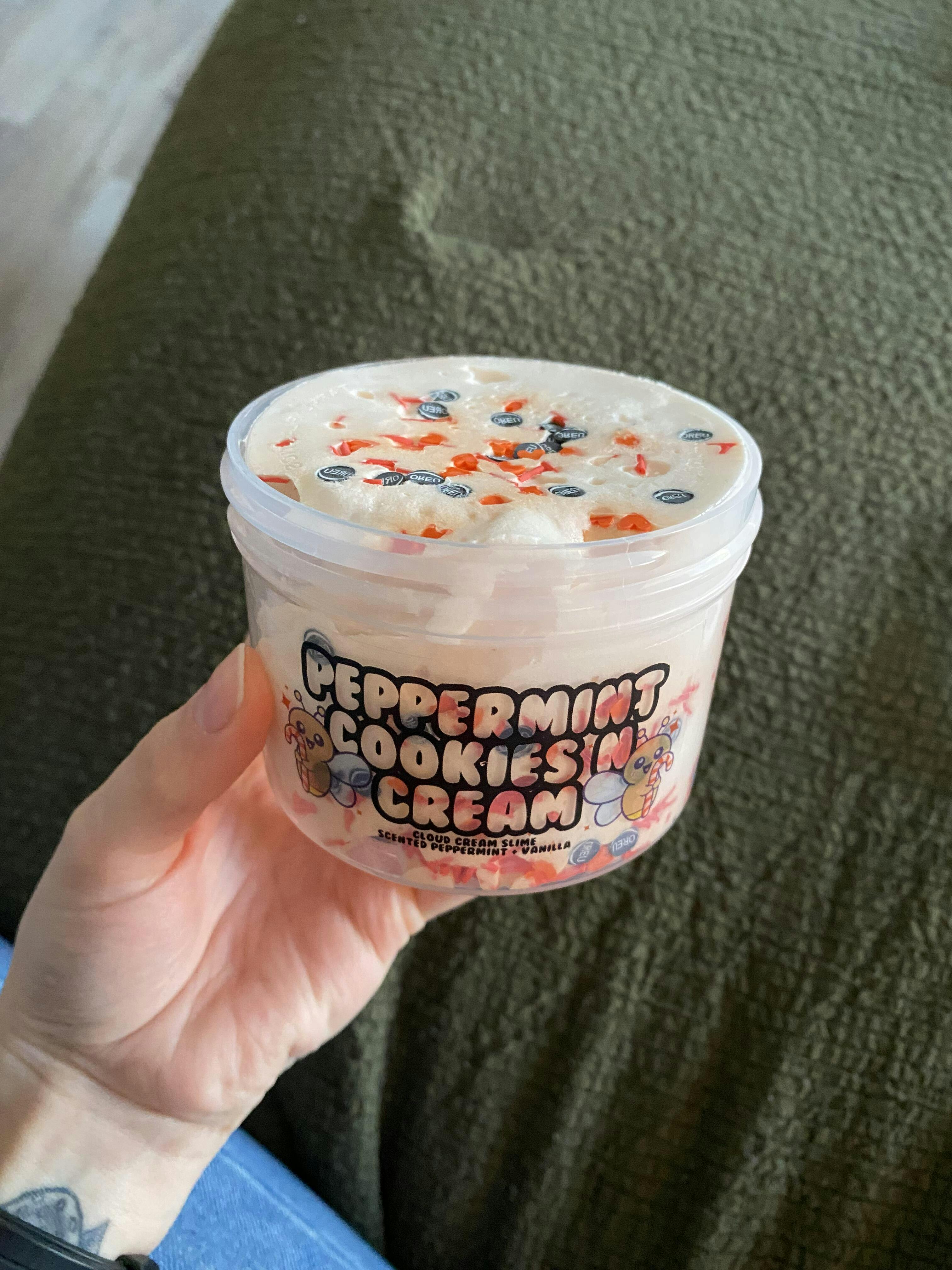 This slime features one of our customer-favorite and most beginner-friendly slime texture mixed with red and black glitter and topped with assorted candy cane sprinkles.